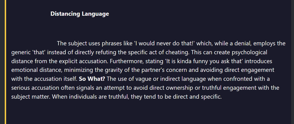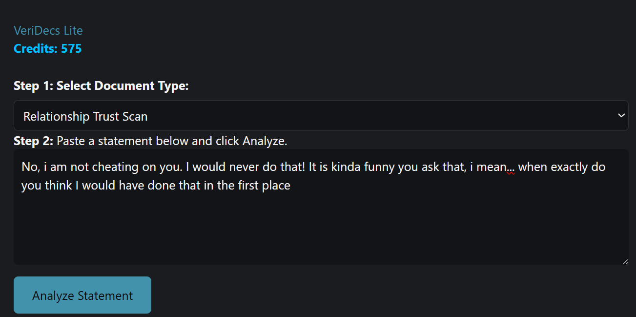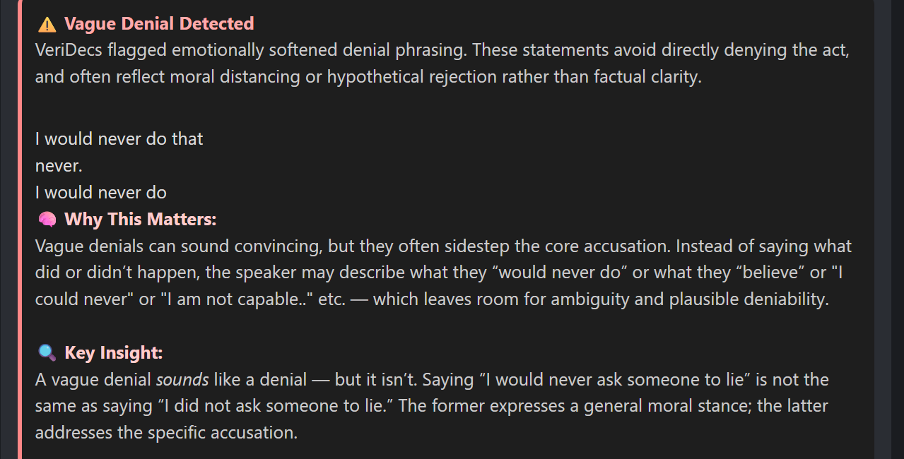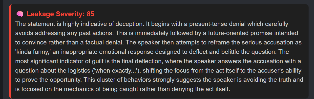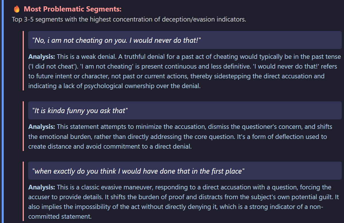 Go beyond surface-level cues with AI-powered analysis that reveals the emotional and structural fingerprint of a statement.